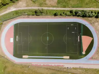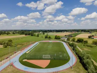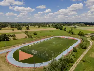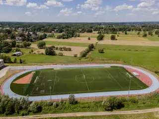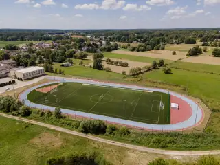 Boisko piłkarskie o powierzchni ponad 6 tyś,m2. Sztuczna trawa sportowa 50mm zasypana granulatem EPDM.