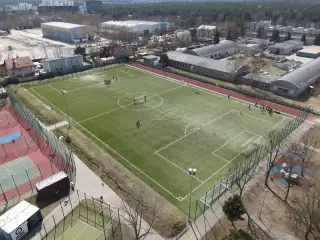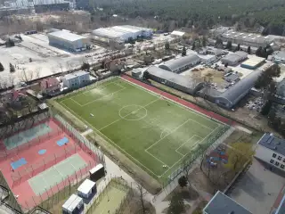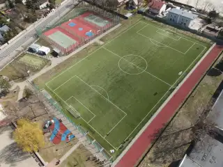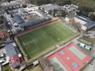 Boisko piłkarskie, zlokalizowane przy XXV LO w Warszawie na ul. Halnej, o wymiarze pola gry 60x105. Pod sztuczną trawą o wysokości włókna 50mm zastosowano shockpad X-PAD 10-200 o grubości 10mm.